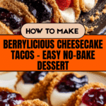These Berrylicious Cheesecake Tacos combine creamy cheesecake filling with crispy, graham-cracker-coated tortilla shells for a delightful twist on a classic dessert. Topped with sweet blueberry and strawberry jam, they’re perfect for a fun and easy treat that will impress your guests.
