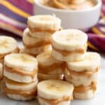 - Assemble Bites: Spread a generous smear of peanut butter onto one banana slice and sandwich it with another slice to make a bite-sized sandwich.