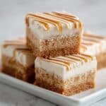 The image shows a close-up of soft square cake pieces with three distinct layers. The bottom layer is light brown with a moist, spongy texture. The middle layer is thin and darker brown, with a slightly rough texture. The top layer is thick and creamy white frosting, smooth in texture and covering the whole surface of each piece. On the frosting, there are thin caramel-colored drizzle lines, creating a simple striped pattern. The cake squares are stacked neatly on a white rectangular dish placed on a white marbled textured surface. Photo taken with an iphone --ar 4:5 --v 7