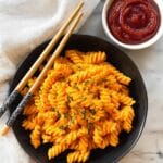 A black bowl filled with bright orange spiral pasta coated in a creamy sauce is topped with small green herb pieces scattered evenly over the top layer, giving fresh contrast. Next to the bowl lies a pair of wooden chopsticks with black and white decorative patterns near the thicker end, resting diagonally across the bowl's edge. At the top right is a small white bowl containing a thick, deep red sauce with a swirled texture. The scene is set on a white marbled surface with a soft white cloth partially visible in the top left corner. photo taken with an iphone --ar 4:5 --v 7