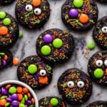 These Halloween Cookies are a festive treat perfect for the spooky season. Made with a rich blend of black cocoa powder and classic cookie ingredients, they’re studded with Halloween-themed M&M’s, jimmies, and candy eyeballs for a fun, colorful twist. Crispy on the edges and soft in the center, these cookies are ideal for holiday parties or trick-or-treaters looking for something delicious and visually entertaining.