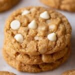 A close-up view of a stack of soft, golden brown cookies with rough, slightly cracked surfaces showing small white chocolate chips embedded in the top cookie. The top cookie has about seven visible chips that are smooth, creamy white, and slightly melted into the warm texture of the cookie dough. The color of the cookie dough is light brown with a sandy, grainy texture resembling cinnamon sugar sprinkles. The cookies are placed on a white marbled texture surface, highlighting their warm tones and soft, chewy look. Photo taken with an iphone --ar 4:5 --v 7