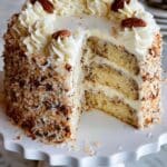 - Layer and frost: Frost each layer, sprinkling with reserved toasted pecans between layers. Add the final layer and frost top and sides of cake.