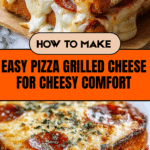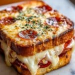 This Pizza Grilled Cheese is a delicious fusion of classic grilled cheese and pizza flavors, featuring melted mozzarella and Parmesan cheeses, turkey pepperoni, and a hint of Italian seasoning. Perfect for a quick and comforting meal, it combines buttery toasted bread with rich marinara sauce and fresh basil for an irresistible treat.
