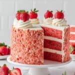 Keywords: Strawberry cake, strawberry gelatin cake, layered cake, buttercream frosting, Oreo topping, strawberry dessert, crunchy cake topping