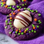 A close-up of two thick, soft-looking purple cookies with a cracked surface, each topped with a white chocolate kiss that has smooth brown stripes. Around the chocolate kiss, there is a ring of small round sprinkles in bright orange, green, black, and purple colors, adding a playful texture to the cookie's rough surface. The cookies sit on a purple cloth, which is gently folded and textured. In the background, there is a blurry glass with a purple liquid that matches the cookie color, all set on a white marbled surface. photo taken with an iphone --ar 4:5 --v 7